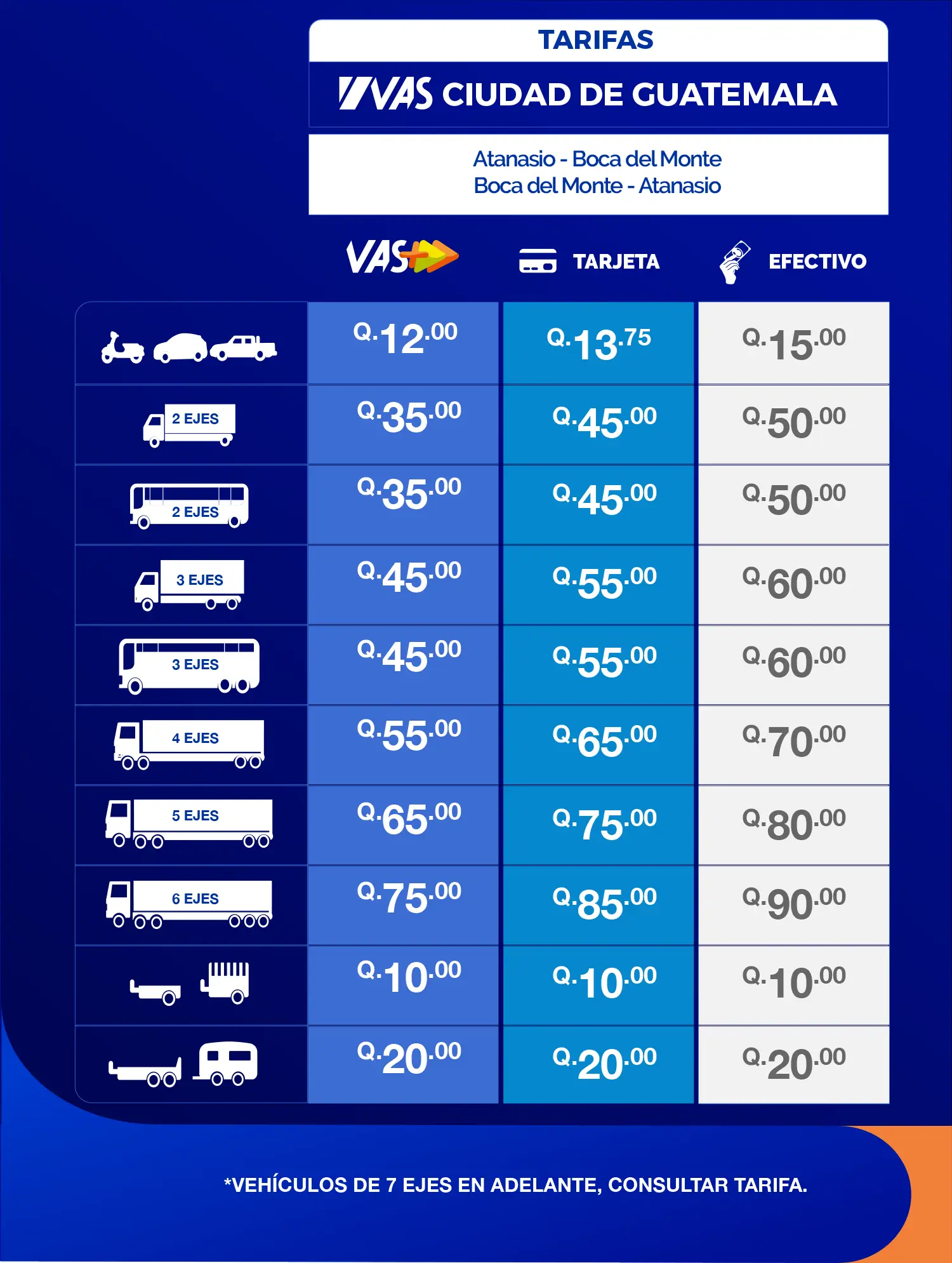 VAS Ciudad de Guatemala comunica de manera fluida la calzada Atanasio Tzul zona 12, a inmediaciones de la 39 y 42 calle con los municipios de San Miguel Petapa y Villa Canales, alrededor del kilómetro 14 (RD1) al final de Boca del Monte en el sector de los Álamos.